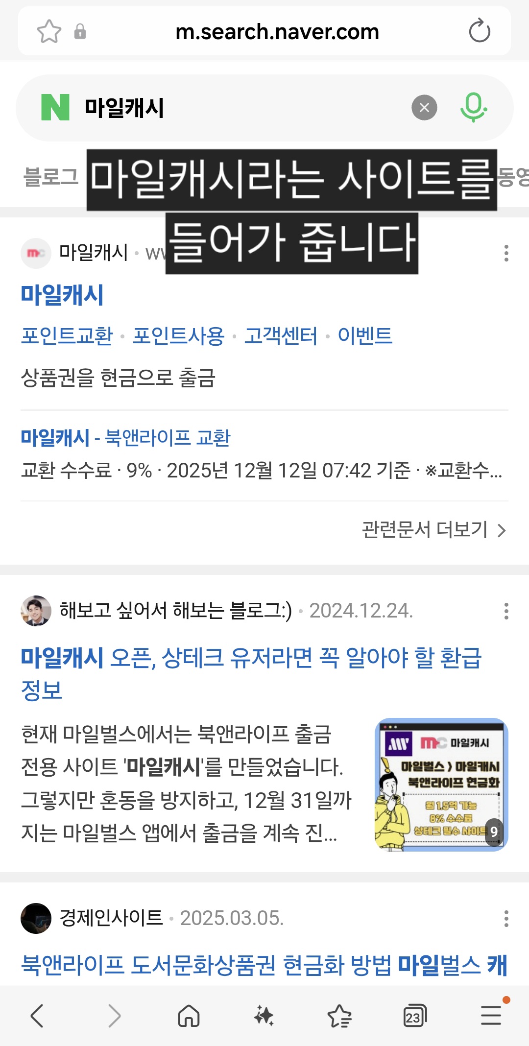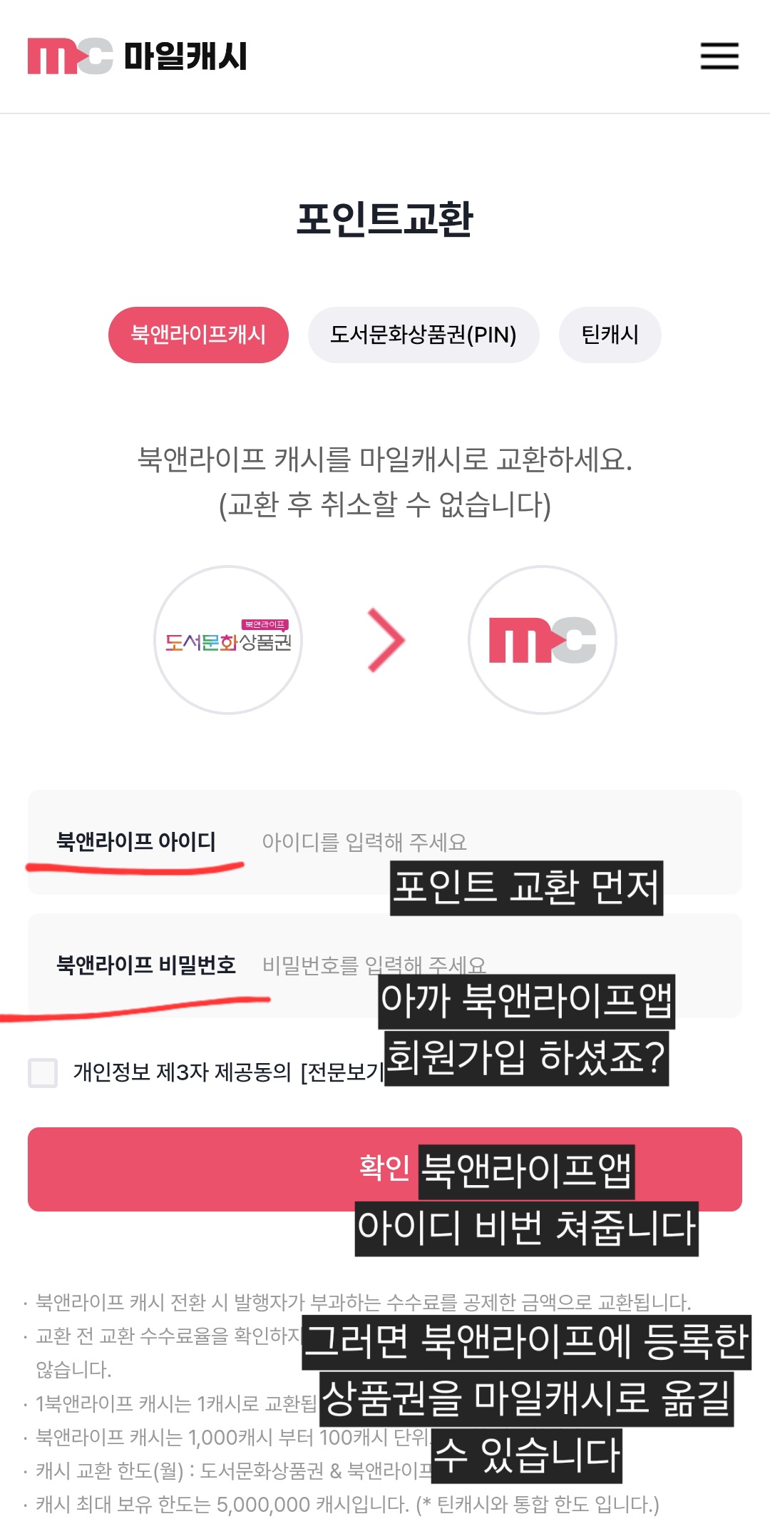 🔹️2-2번) 북앤라이프 앱에 등록한 상품권은 마일캐시로 교환 가능합니다 (현금화하기 위해서는 과정이 필요합니다)