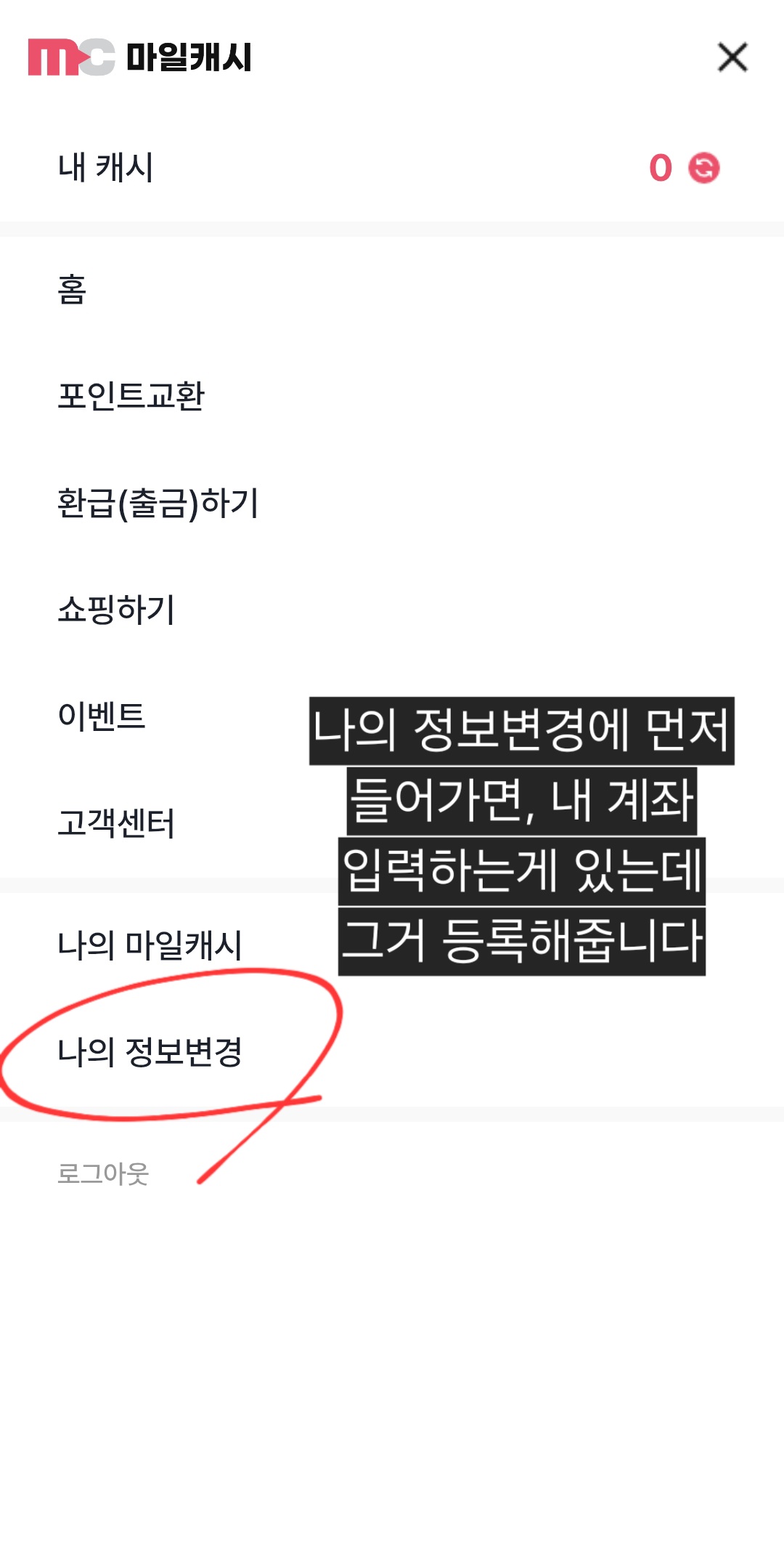 🔹️2-3번) 마일캐시로 교환했으면, 마일캐시는 현금으로 바꿀 수 있습니다(환급 출금하기 기능)