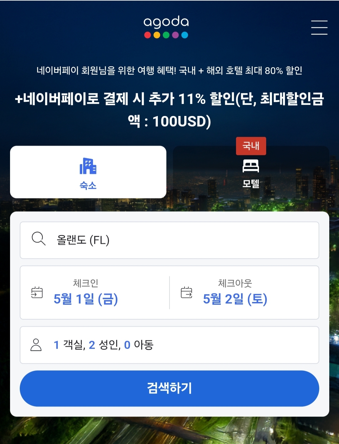 자유게시판 아고다 / 네이버페이 결제 시, 추가 11% 할인 2026. 4. 22. 오후 11:06:22 | 9 | 2 | 0 하잉이 ⚠️최대 할인 금액 100usd (선불 결제조건)⚠️예약기간: 4월 30일까지⚠️숙박기간: 6월 30일까지⚠️프로모션 링크를 통해 진입 시에만, 할인 적용⚠️링크 미진입 전 가격이랑 꼭 비교해보기!https://www.agoda.com/ko-kr/naverpaypromo?cid=1963008&tag=A100604766&ds=k73lUzYfpJfWg%2Bdynaverpaypromohttps://www.agoda.com/ko-kr/naverpaypromo?cid=1963008&tag=A100604766&ds=k73lUzYfpJfWg%2Bdy링크 미리보기 생성 중… https://www.agoda.com/ko-kr/naverpaypromo?cid=1963008&tag=A100604766&ds=k73lUzYfpJfWg%2Bdy