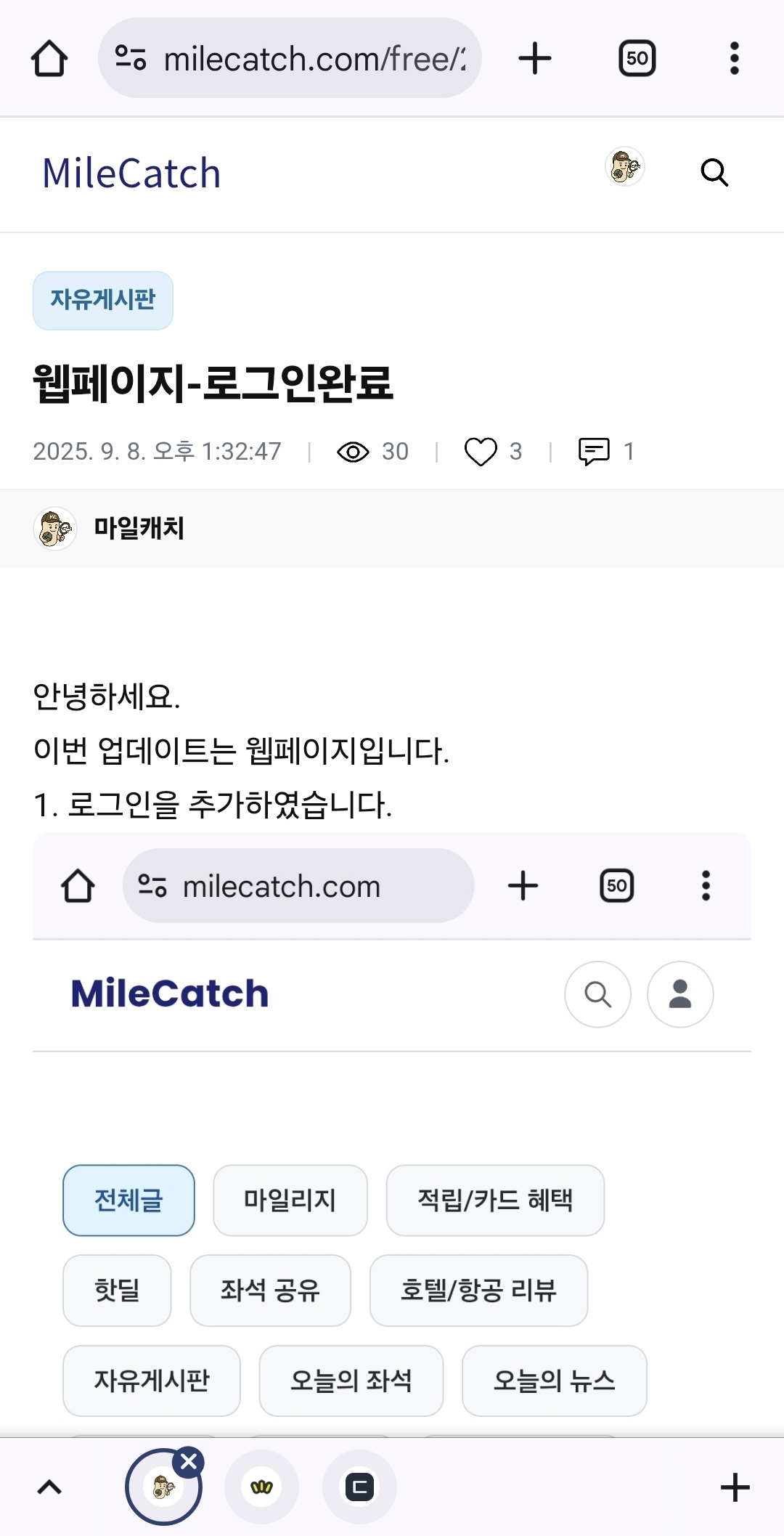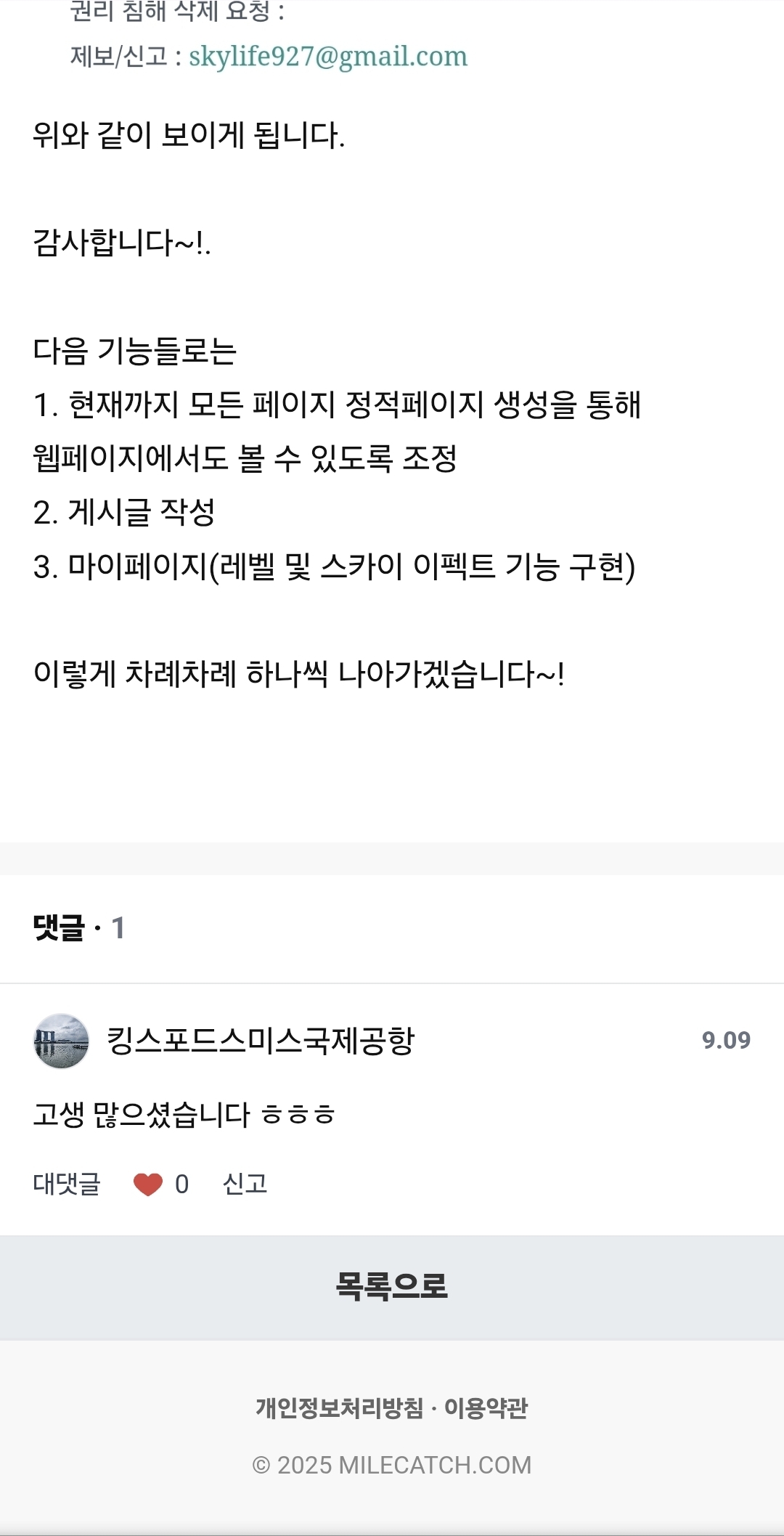 자유게시판 웹페이지 - 상세페이지 2025. 9. 14. 오전 1:01:00 | 76 | 3 | 6 마일캐치 이번에는 상세페이지를 1차 구현하였습니다.위와 같이 웹에서 접속한 링크입니다.이슈: 상단의 마일캐치, 프로필 위치, 로딩시 카테고리 노출,버튼 기능들위의 기능들을 차차 개선해나가겠습니다.https://milecatch.com/free/299.html웹페이지-로그인완료안녕하세요. 이번 업데이트는 웹페이지입니다. 1. 로그인을 추가하였습니다. 우측 상단 프로필을 누르시면 로그인을 합니다. 그럼 이렇게 우측상단에 그라데이션이 적용됨을 볼 수 있고 위와 같이 나옵니다. 프로필 페이지를 누르면 위와 같이 보이게 됩니다. 감사합니다~!. 다음 기능들로는&nbhttps://milecatch.com/free/299.html링크 미리보기 생성 중… https://milecatch.com/free/299.html마일캐치