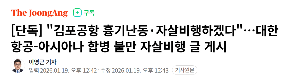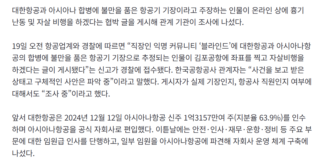 단독] "김포공항 흉기난동·자살비행하겠다"…대한항공-아시아나 합병 불만 자살비행 글 게시