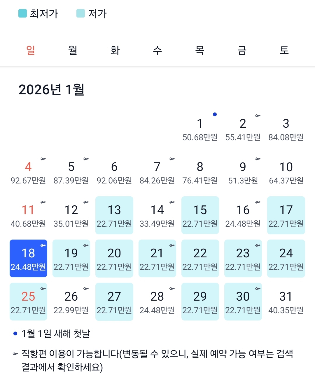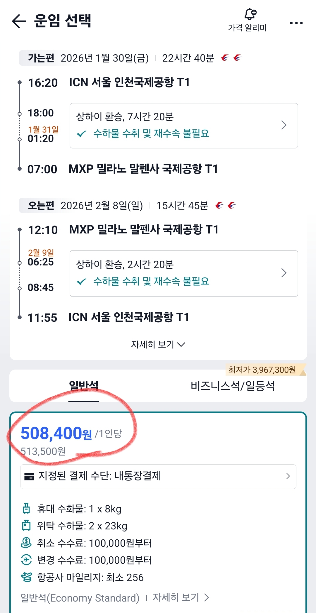 일단은 1월 출발 중으로 밀라노 왕복으로 붙여보았습니다.