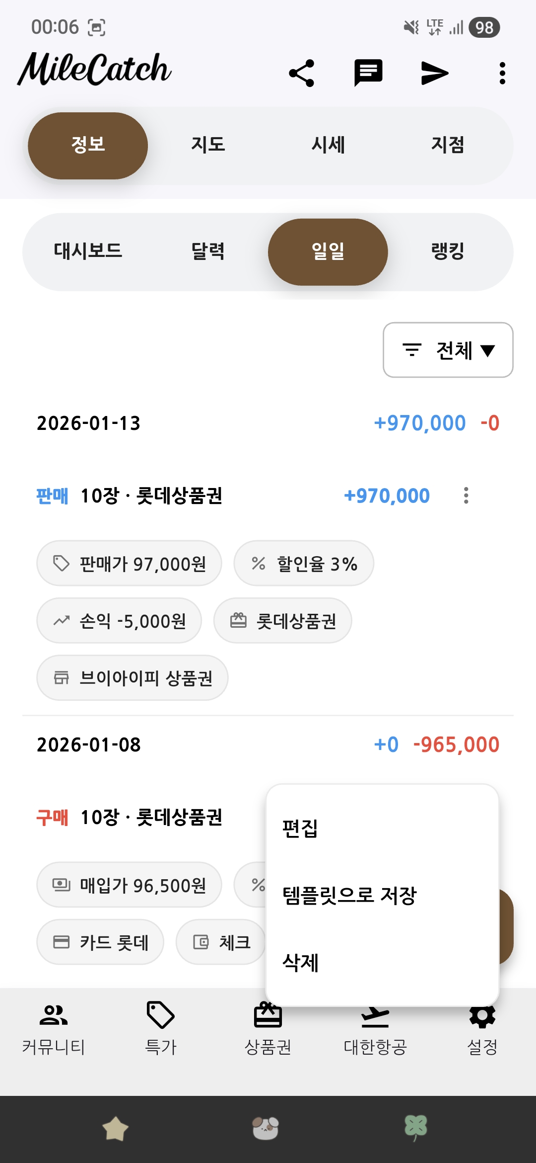 운영 공지사항 안드로이드 2.2.42 버전 업데이트 2026. 3. 14. 오후 3:07:42 | 9 | 1 | 0 마일캐치 상품권 탭 UI 변경 1. 더보기 메뉴 2. 상품권 구매시 상품권 선택, 카드 선택 화면 변경상품권 구매 템플릿 적용 1. 고정 핀 2. 이름 수정 3. 현재 값 저장 4. 현재 값 적용