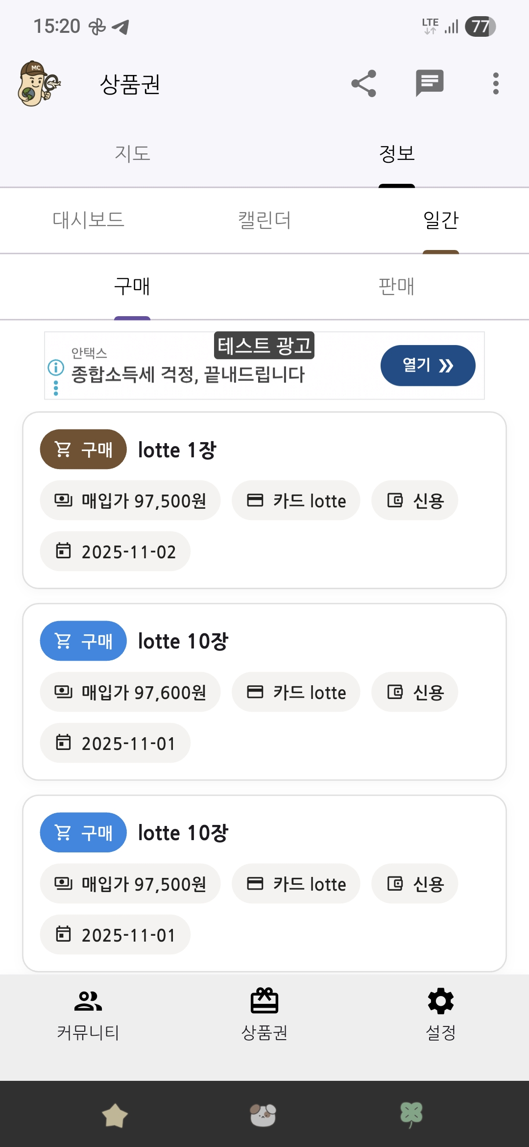 운영 공지사항 안드로이드/아이폰 2.2.11 버전 업데이트 2025. 11. 2. 오전 6:25:46 | 121 | 5 | 3 마일캐치 1. 상품권 지도 이슈 수정2. 일간 탭에서의 구매, 판매 구분 및 구매 색상 변경(갈색, 파랑색)