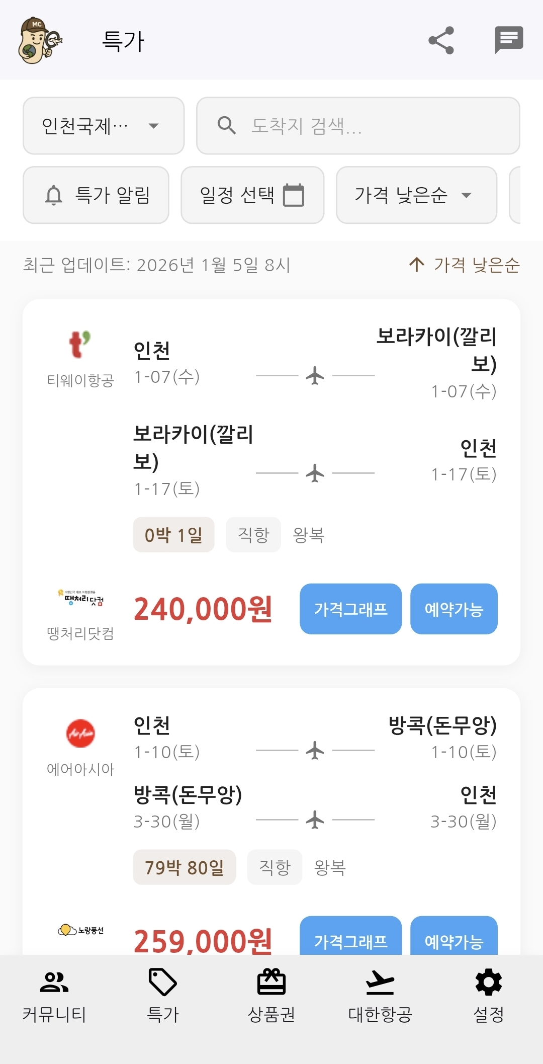 운영 공지사항 안드로이드/아이폰 2.2.27 버전 업데이트 2026. 1. 5. 오전 12:04:02 | 36 | 4 | 2 마일캐치 특가 기능이 출시되었습니다.이제 쉽게 필터를 선택하여 검색하고 예약해보세요.감사합니다.