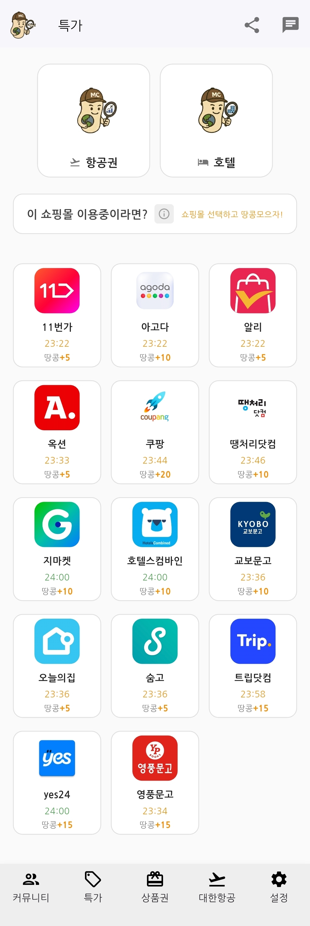 운영 공지사항 안드로이드/아이폰 2.2.36 버전 업데이트 2026. 1. 18. 오후 3:59:36 | 26 | 3 | 0 마일캐치 상품권 - 대시보드 판매 > 구매내역 - 미판매수량 내에서 미교환, 교환완료 로직 적용커뮤니티 - 댓글 이미지 보이지 않음 이슈 - 링크 외부브라우저 호출 특가 - 쇼핑몰 아이콘 추가