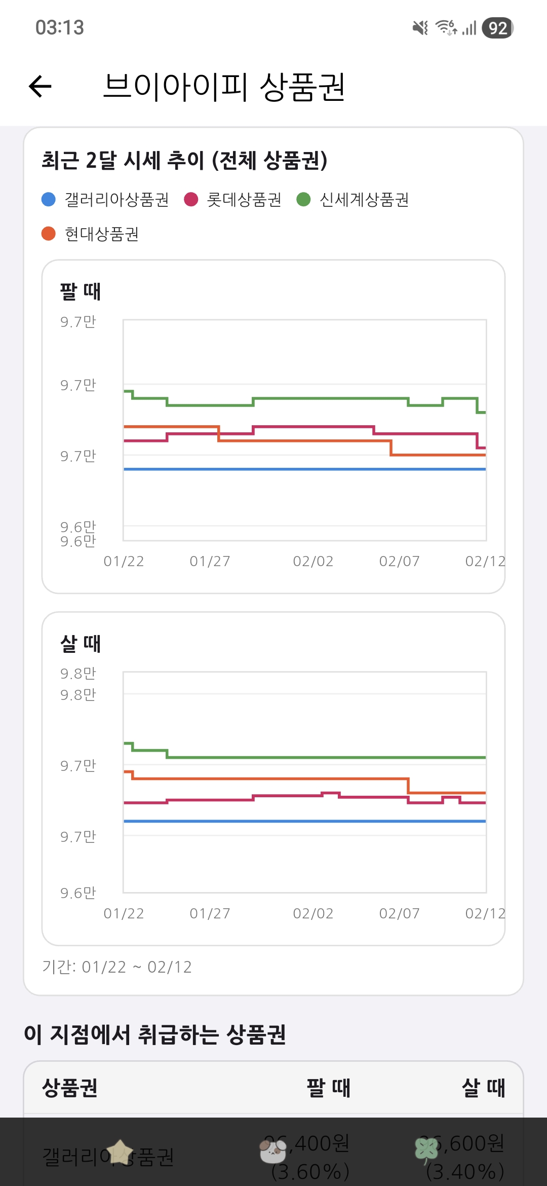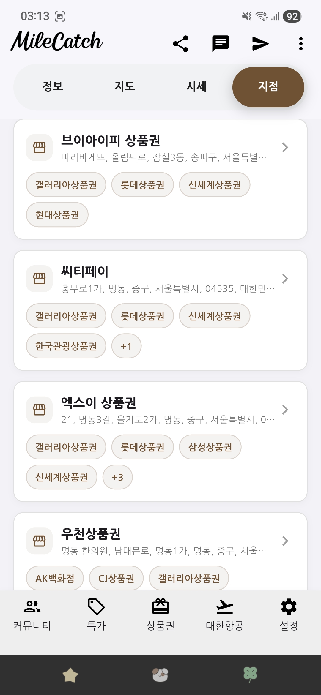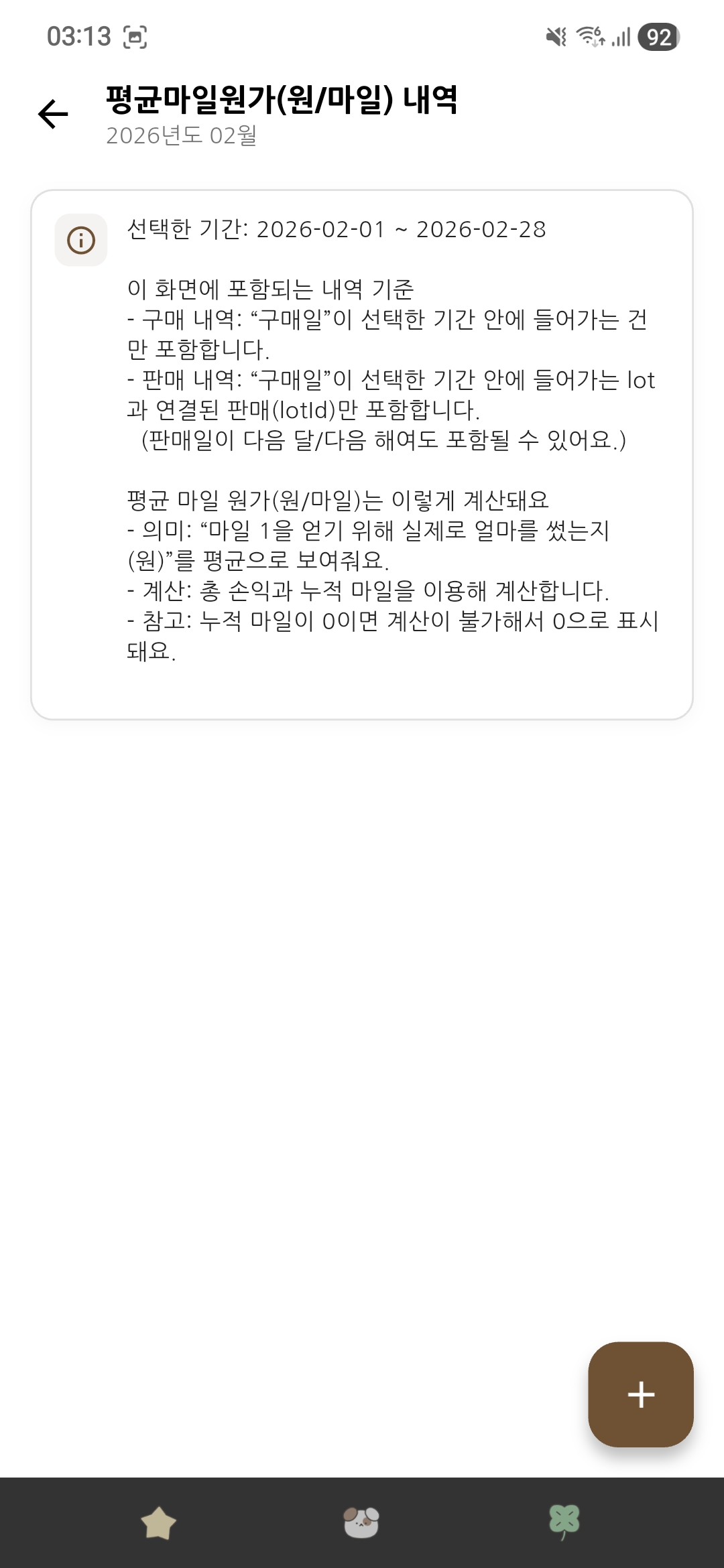 운영 공지사항 안드로이드 2.2.39 버전 업데이트 2026. 2. 11. 오후 6:15:16 | 30 | 2 | 0 마일캐치 1. 상품권 평균마일원가 구매월로 변경2. 상품권 지점탭 추가3. 상품권 그래프 추가