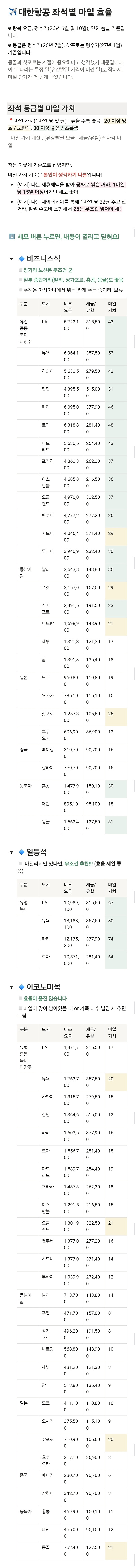 마일리지 게시판 (1탄 - 마일 발권편) 대한항공 마일 효율 2026. 3. 18. 오후 3:22:51 | 69 | 3 | 1 하잉이 이코노미 마일 발권도 괜찮을까요?승급 좌석도 괜찮을까요?이 노선이면 효율 괜찮을까요?이런 궁금증이 많으시리라 생각합니다!아래 마일 단가표 보시고, 이정도 등급/노선이면 나는 발권 할만하다! 등등 을 파악해보셔유🤍<26년 1월 발권가 기준입니다>