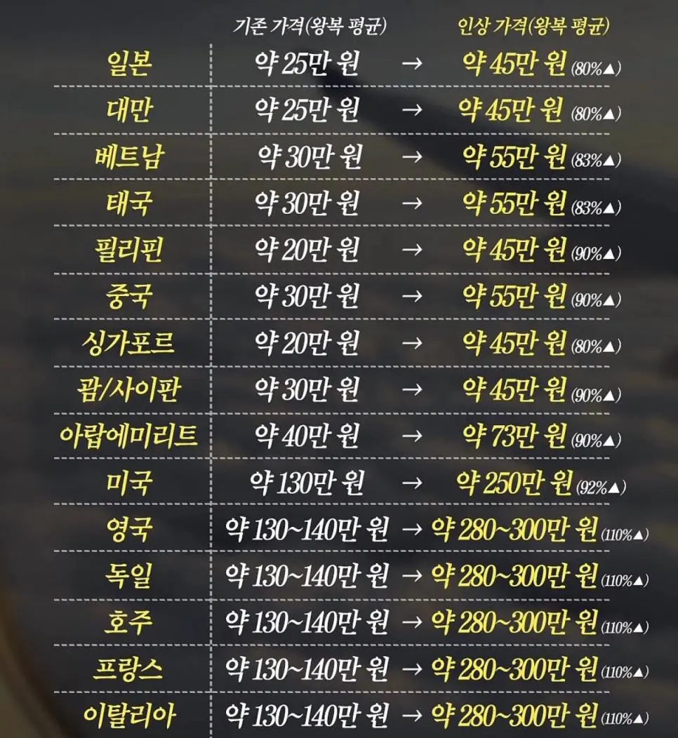 유류할증료 인상 후 왕복 항공권 평균가격