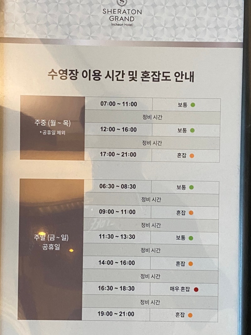 일단 간단하게 샤워룸에서 씻고 물에 들어가기까지도 너무 오래 걸리고 레일 하나를 강습으로 사용하다보니 절망이네요. 수영장을 이용하고 싶으시면 위에 시간 테이블중에 보통인 시간에 방문하시는 걸 강력 추천해요. 왜 다들 인천 송도 쉐라톤 호텔 수영장은 패스하는지 알 것 같았어요. 결국 저도 수영장 1장만 쓰고 나머지는 사용 안함.