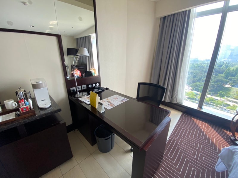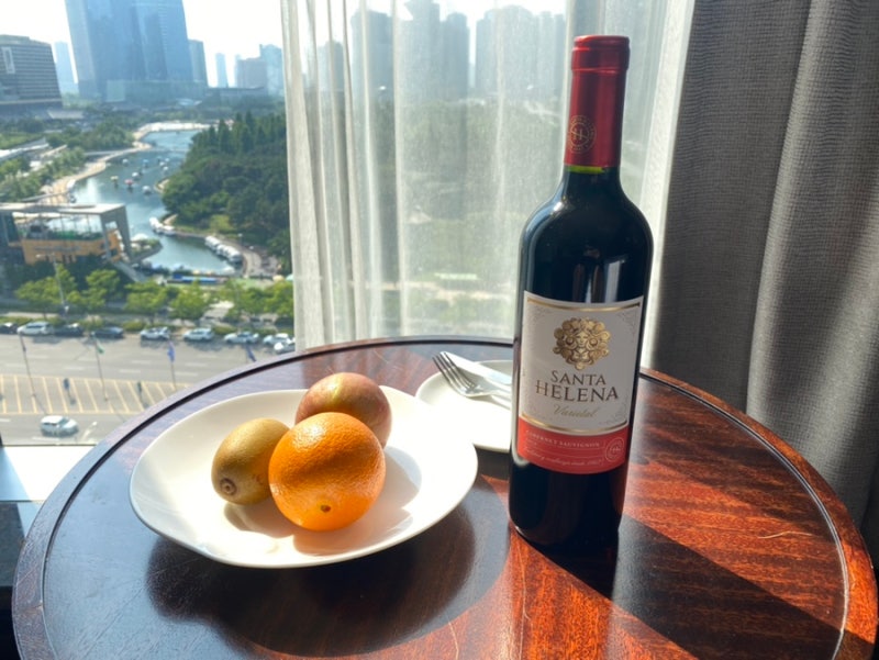 메리어트 본보이 포인트로 어디를 방문할까 고민하다가 서비스 평이 좋은 인천 송도 쉐라톤 호텔에 방문했어요. 인천 송도 쉐라톤 호텔 자체를 처음 방문해서 그런지 웰컴기프트로 와인이랑 과일플래터를 받았고 스위트룸 업글과 레이트 체크아웃(15시) 두가지 중에 선택하라고 해서 룸업글을 선택했어요. 룸은 공원 뷰라 좋았지만 층이 저층이라 좀 아쉬웠어요.