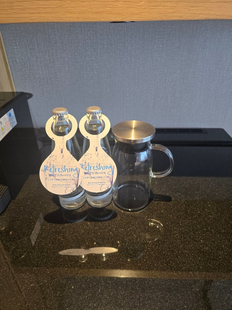 물은 이렇게 유리로 된 생수두병과 물병을 주는데, 이 물병이 아주 좋았던!!!!