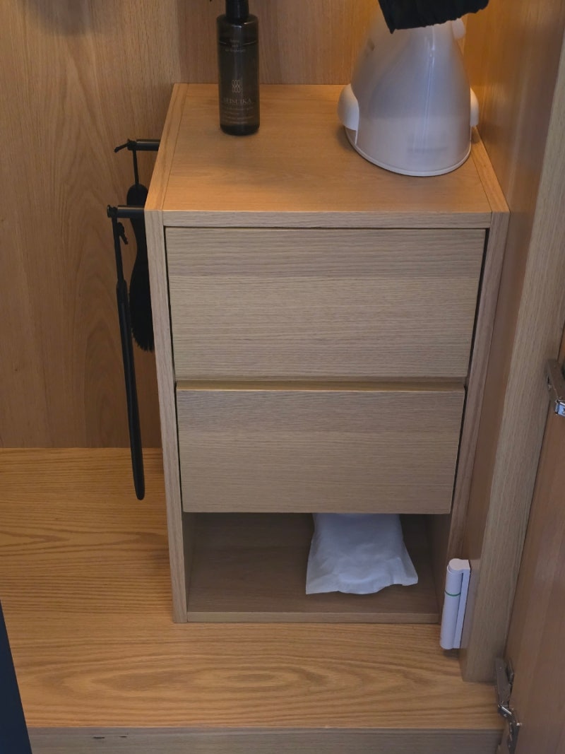 옷장속에 슬리퍼와 탈취제들이 있고 다리미도 있음